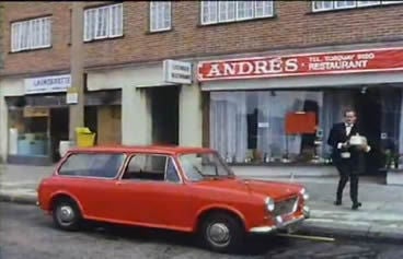 Hier wordt de oranje Austin 1300 GT gekraakt. Auw.. !!